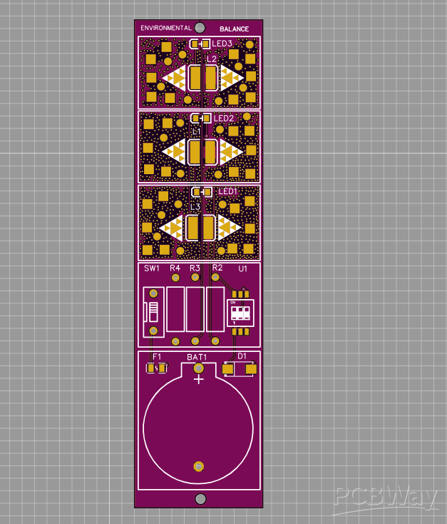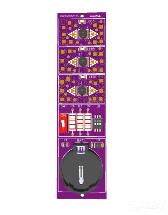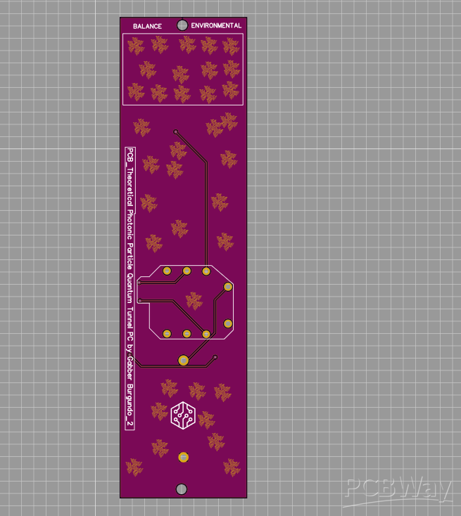 Title: Theoretical Photonic Particle Quantum Tunnel PC Project Type: Experimental Research Device / PCB Art Designer: Gabber Burgundo Overview: The "Theoretical Photonic Particle Quantum Tunnel PC" is an experimental artistic project that explores the intersection of hardware design and speculative science. While the name suggests complex quantum mechanics, the device functions as a piece of PCB Art, utilizing the physical layout of a Printed Circuit Board as a canvas for visual expression. Technical Layout: The board features a vertical orientation powered by a coin cell battery (BAT1). The circuit includes three distinct stages, each equipped with an inductor (L1, L2, L3) and an LED (LED1, LED2, LED3), paired with current-limiting resistors (R2, R3, R4). A slide switch (SW1) and a protection diode (D1) manage the power flow. Artistic Intent: The design utilizes intricate copper pours and geometric patterns (triangles and squares) to create a "techno-mystical" aesthetic. By labeling the device with terms like "Quantum Tunnel" and "Environmental Balance," the artist invites the viewer to reflect on the relationship between visible light (photons) and the invisible forces of electronic components. It is a functional sculpture designed to provoke curiosity rather than perform traditional computing tasks.