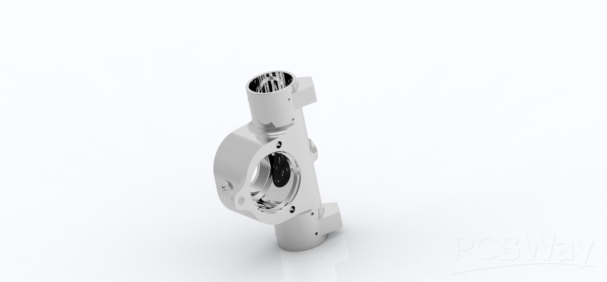The housing serves as the primary connection point for bonded carbon fiber tubes, which guide and protect the steering rack. This requires good surface quality and dimensional accuracy to ensure a secure adhesive bond and perfect alignment of the entire assembly.